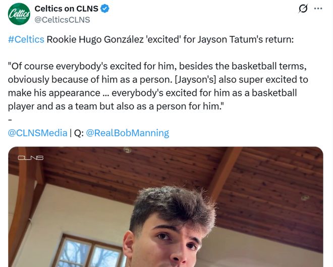 因此在塔图姆确定复出后,绿军新秀冈萨雷斯坦言:“每个人都对此感到兴奋,这不仅仅是篮球层面,而是因为他这个人,塔图姆自己也对即将登场超级兴奋,大家都真心为他感到开心。”