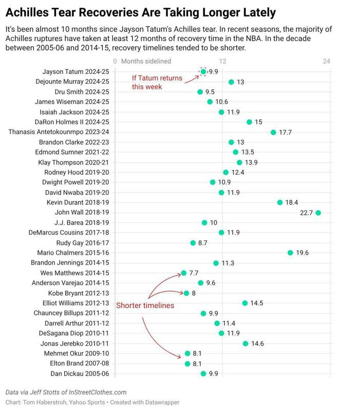 按照《雅虎体育》记者Tom Haberstroh的统计,联盟过去10年球星跟腱撕裂(断裂)伤病的休息时间平均约为13个月。