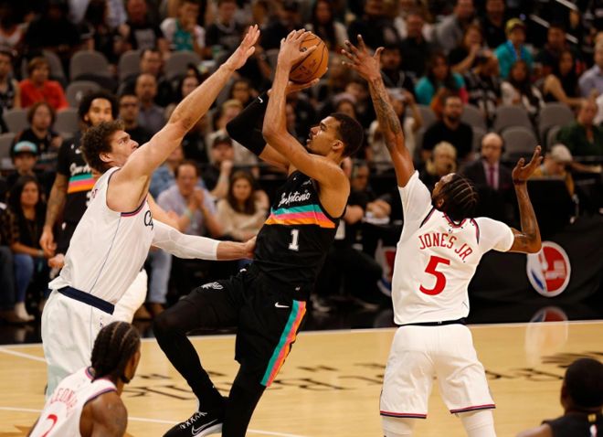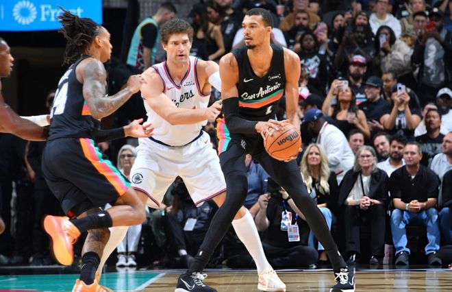 快船进攻明显下滑,中段福克斯连续单打,配合瓦塞尔的三分球,一波13-0反超快船!马刺无脑包夹伦纳德,队友没输出!中段小卡艰难出手命中,文班亚马强攻,伦纳德顶着夹击继续跳投,随后抢断卡斯尔,反击劈扣再度反超比分!最后5分钟,科内特补扣+布莱恩特三分球帮马刺夺回领先,大洛吃饼,伦纳德造犯规反超。最后1分钟,文班亚马命中关键三分,德里克琼斯硬刚文班亚马,打成2+1!文班亚马反击暴扣,留给快船16秒时间。结果大洛给巴图姆传球,巴图姆还在场外接球,直接失误!马刺叫暂停,快船犯规战术,尚帕尼两罚不中给机会!